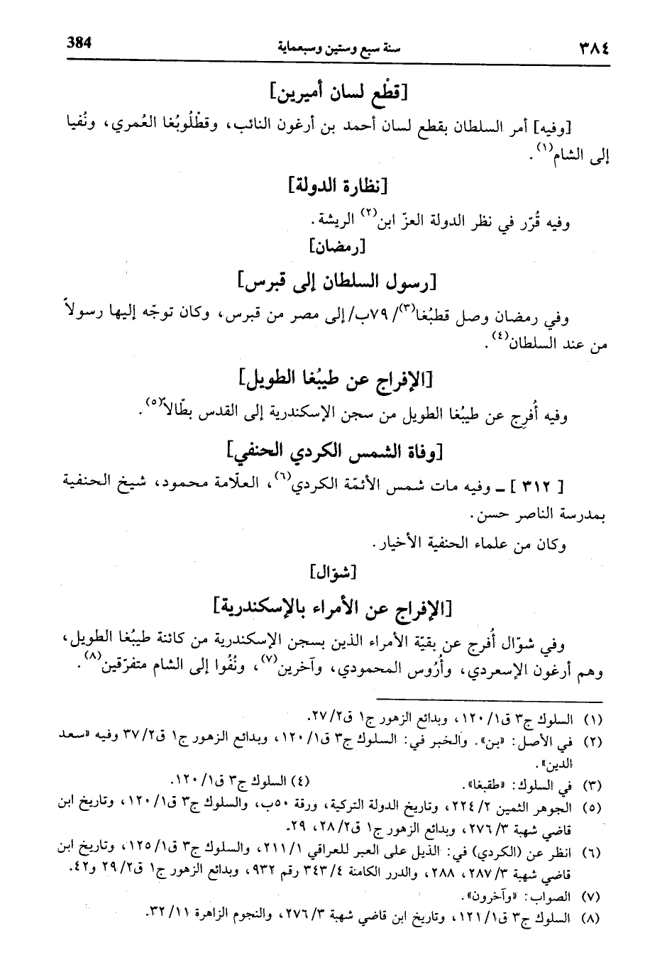 (¬5) الجوهر الثمين 2/ 224، وتاريخ الدولة التركية، ورقة 50 ب، والسلوك ج 3 ق 1/ 120، وتاريخ ابن قاضي شهبة 3/ 276، وبدائع الزهور ج 1 ق 2/ 28، 29.