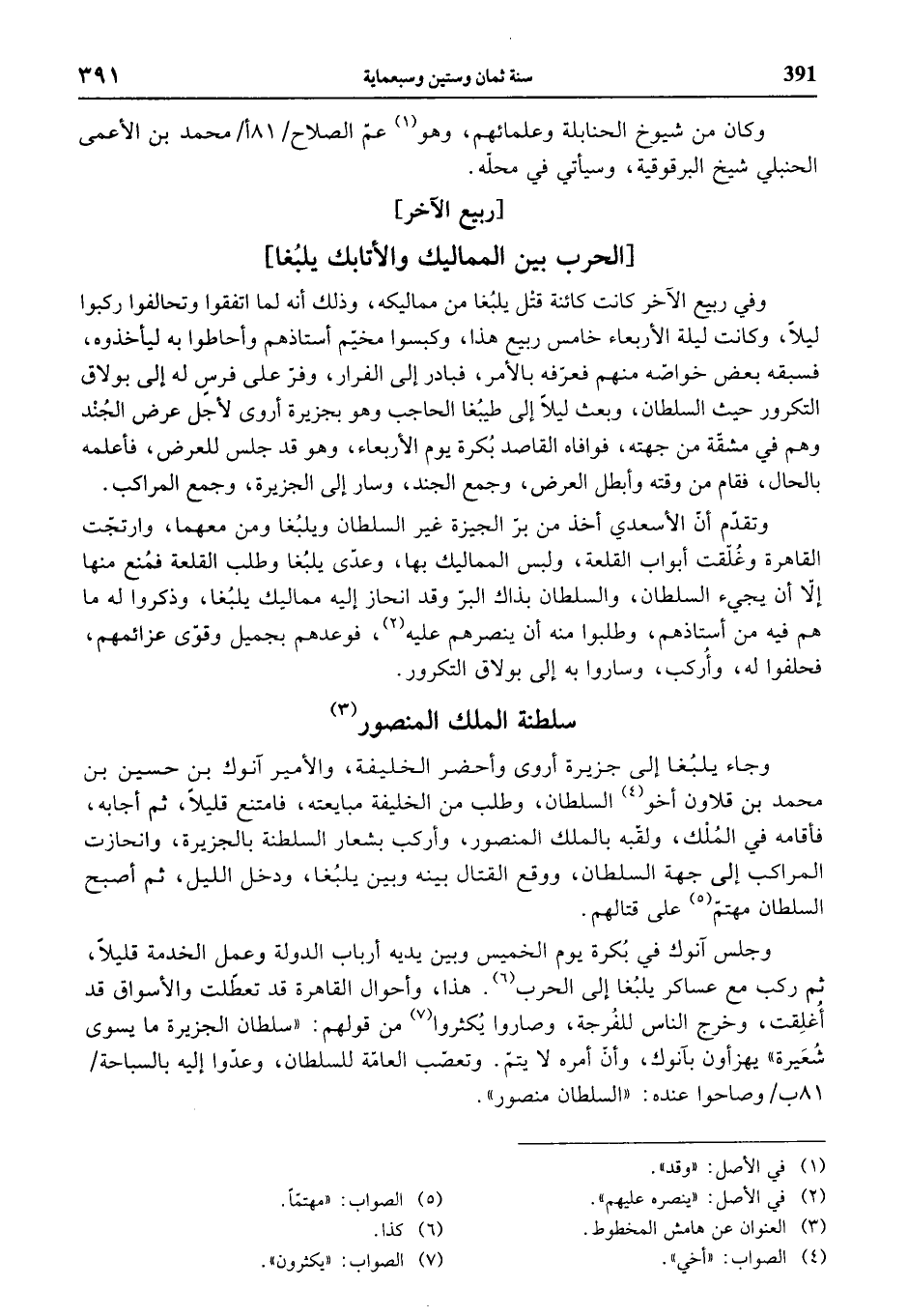 وجلس آنوك في بكرة يوم الخميس وبين يديه أرباب الدولة وعمل الخدمة قليلا، ثم ركب مع عساكر يلبغا إلى الحرب (¬6). هذا، وأحوال القاهرة قد تعطّلت والأسواق قد أغلقت، وخرج الناس للفرجة، وصاروا يكثروا (¬7) من قولهم: «سلطان الجزيرة ما يسوى شعيرة» يهز أون بآنوك، وأنّ أمره لا يتمّ. وتعصّب العامّة للسلطان، وعدّوا إليه بالسباحة / 81 ب / وصاحوا عنده: «السلطان منصور».