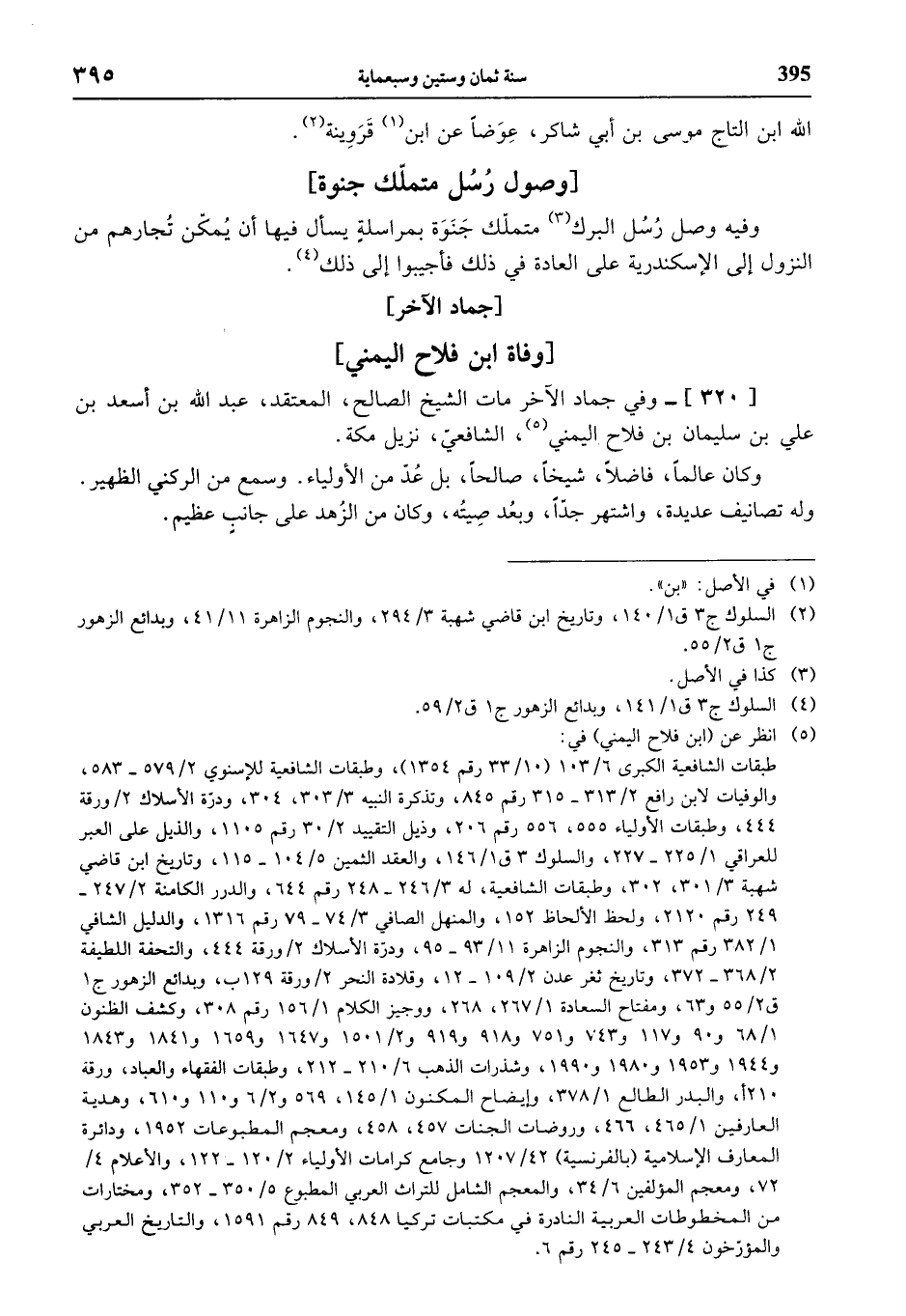 (¬5) انظر عن (ابن فلاح اليمني) في: طبقات الشافعية الكبرى 6/ 103 (10/ 33 رقم 1354)، وطبقات الشافعية للإسنوي 2/ 579 - 583، والوفيات لابن رافع 2/ 313 - 315 رقم 845، وتذكرة النبيه 3/ 303، 304، ودرّة الأسلاك 2 / ورقة 444، وطبقات الأولياء 555، 556 رقم 206، وذيل التقييد 2/ 30 رقم 1105، والذيل على العبر للعراقي 1/ 225 - 227، والسلوك 3 ق 1/ 146، والعقد الثمين 5/ 104 - 115، وتاريخ ابن قاضي شهبة 3/ 301، 302، وطبقات الشافعية، له 3/ 246 - 248 رقم 644، والدرر الكامنة 2/ 247 - 249 رقم 2120، ولحظ الألحاظ 152، والمنهل الصافي 3/ 74 - 79 رقم 1316، والدليل الشافي 1/ 382 رقم 313، والنجوم الزاهرة 11/ 93 - 95، ودرّة الأسلاك 2 / ورقة 444، والتحفة اللطيفة 2/ 368 - 372، وتاريخ ثغر عدن 2/ 109 - 12، وقلادة النحر 2 / ورقة 129 ب، وبدائع الزهور ج 1 ق 2/ 55 و 63، ومفتاح السعادة 1/ 267، 268، ووجيز الكلام 1/ 156 رقم 308، وكشف الظنون 1/ 68 و 90 و 117 و 743 و 751 و 918 و 919 و 2/ 1501 و 1647 و 1659 و 1841 و 1843 و 1944 و 1953 و 1980 و 1990، وشذرات الذهب 6/ 210 - 212، وطبقات الفقهاء والعباد، ورقة 210 أ، والبدر الطالع 1/ 378، وإيضاح المكنون 1/ 145، 569 و 2/ 6 و 110 و 610، وهدية العارفين 1/ 465، 466، وروضات الجنات 457، 458، ومعجم المطبوعات 1952، ودائرة المعارف الإسلامية (بالفرنسية) 42/ 1207 وجامع كرامات الأولياء 2/ 120 - 122، والأعلام 4/ 72، ومعجم المؤلفين 6/ 34، والمعجم الشامل للتراث العربي المطبوع 5/ 350 - 352، ومختارات من المخطوطات العربية النادرة في مكتبات تركيا 848، 849 رقم 1591، والتاريخ العربي والمؤرّخون 4/ 243 - 245 رقم 6.