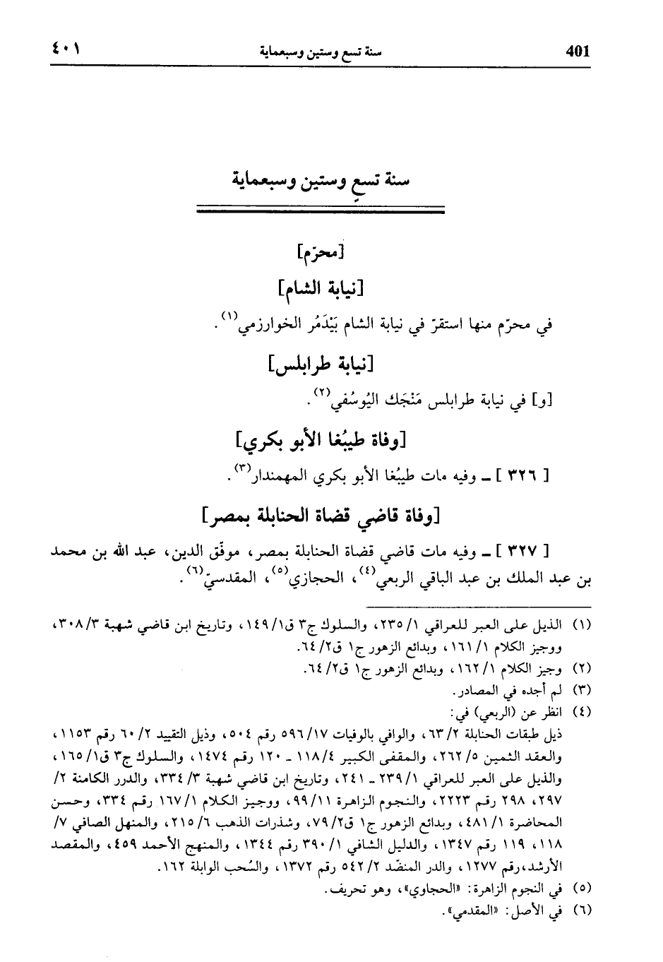(¬4) انظر عن (الربعي) في: ذيل طبقات الحنابلة 2/ 63، والوافي بالوفيات 17/ 596 رقم 504، وذيل التقييد 2/ 60 رقم 1153، والعقد الثمين 5/ 262، والمقفى الكبير 4/ 118 - 120 رقم 1474، والسلوك ج 3 ق 1/ 165، والذيل على العبر للعراقي 1/ 239 - 241، وتاريخ ابن قاضي شهبة 3/ 334، والدرر الكامنة 2/ 297، 298 رقم 2223، والنجوم الزاهرة 11/ 99، ووجيز الكلام 1/ 167 رقم 334، وحسن المحاضرة 1/ 481، وبدائع الزهور ج 1 ق 2/ 79، وشذرات الذهب 6/ 215، والمنهل الصافي 7/ 118، 119 رقم 1347، والدليل الشافي 1/ 390 رقم 1344، والمنهج الأحمد 459، والمقصد الأرشد، رقم 1277، والدر المنضّد 2/ 542 رقم 1372، والسحب الوابلة 162.
