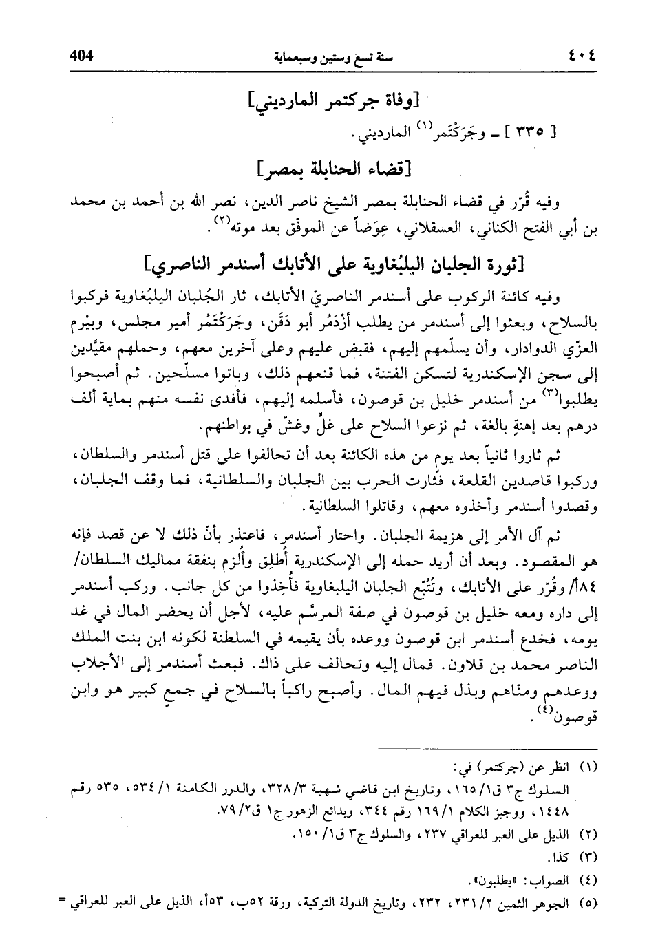 (¬1) انظر عن (جركتمر) في: السلوك ج 3 ق 1/ 165، وتاريخ ابن قاضي شهبة 3/ 328، والدرر الكامنة 1/ 534، 535 رقم 1448، ووجيز الكلام 1/ 169 رقم 344، وبدائع الزهور ج 1 ق 2/ 79.