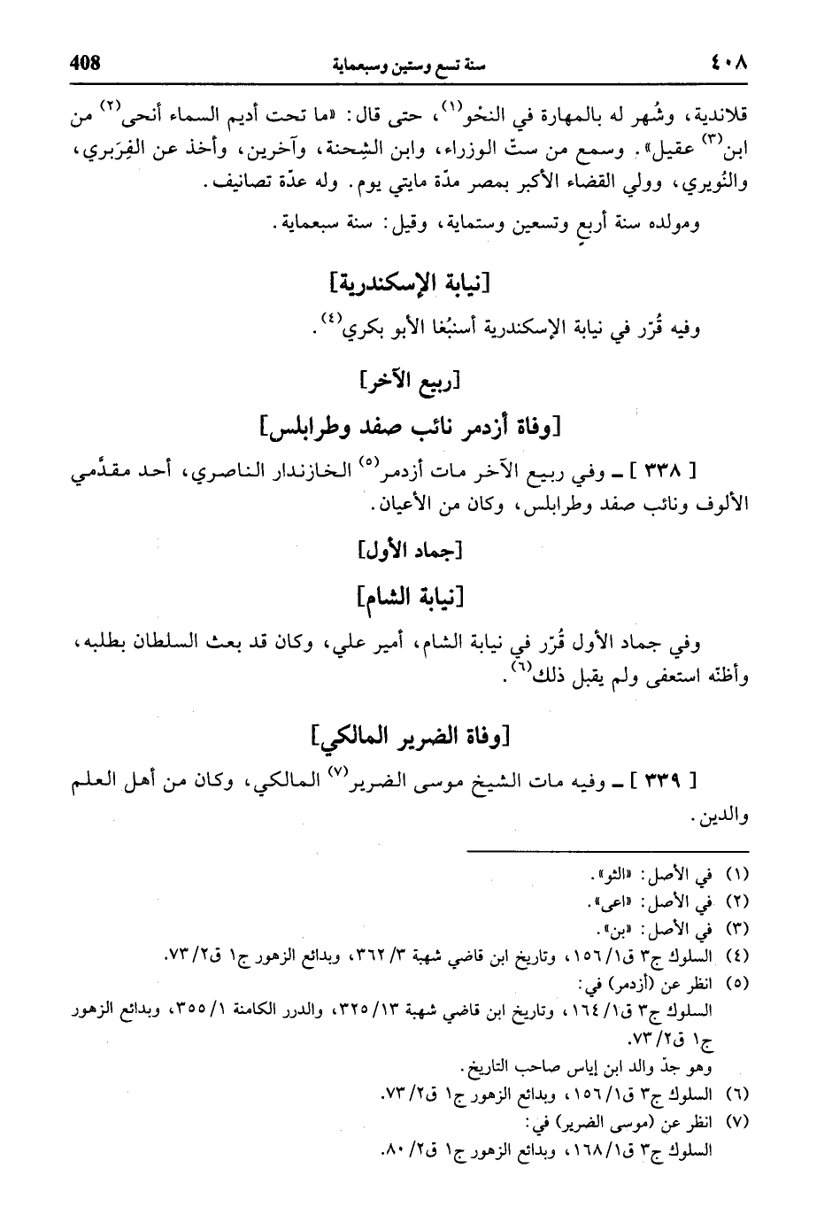 (¬4) السلوك ج 3 ق 1/ 156، وتاريخ ابن قاضي شهبة 3/ 362، وبدائع الزهور ج 1 ق 2/ 73.