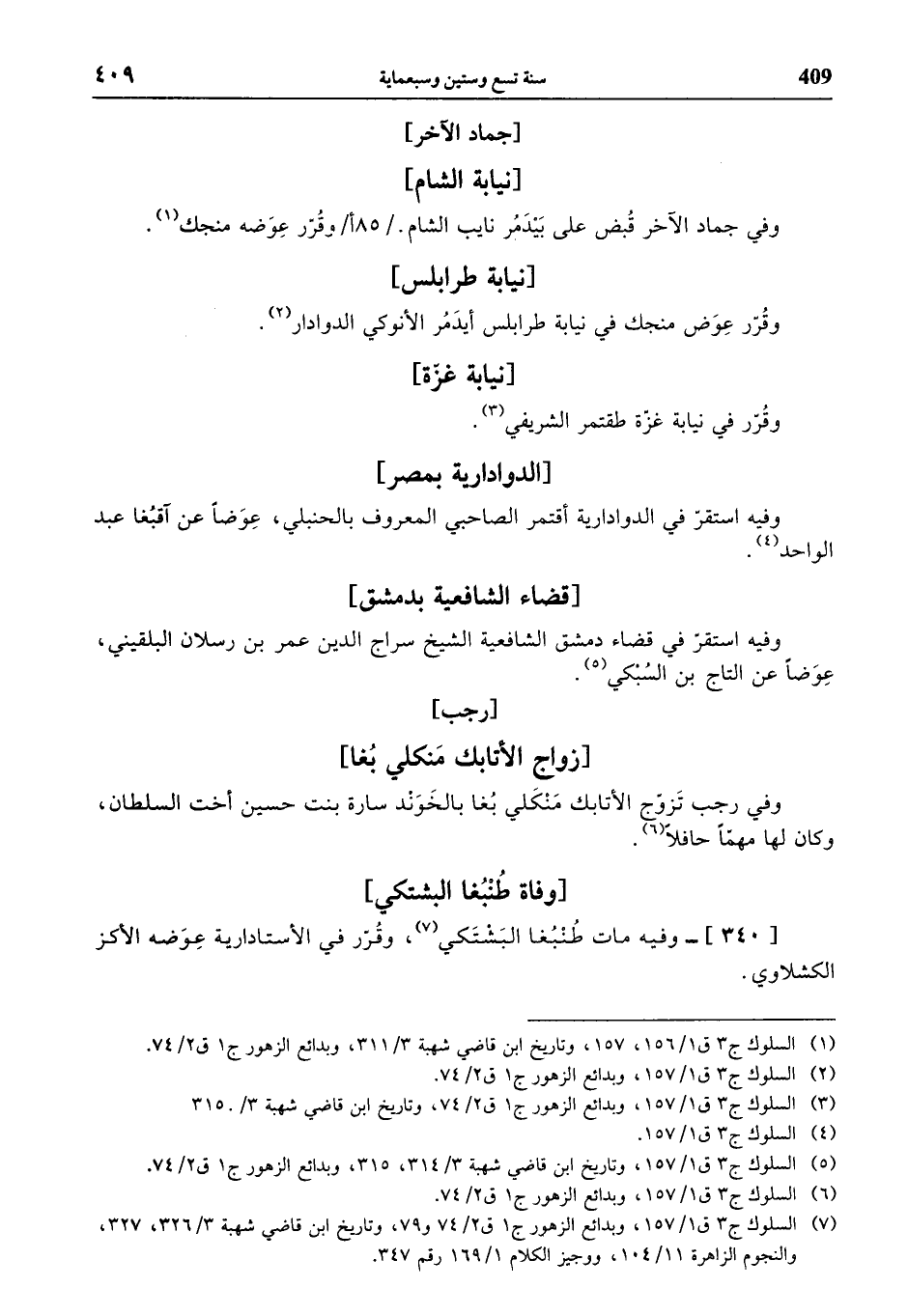 (¬7) السلوك ج 3 ق 1/ 157، وبدائع الزهور ج 1 ق 2/ 74 و 79، وتاريخ ابن قاضي شهبة 3/ 326، 327، والنجوم الزاهرة 11/ 104، ووجيز الكلام 1/ 169 رقم 347.
