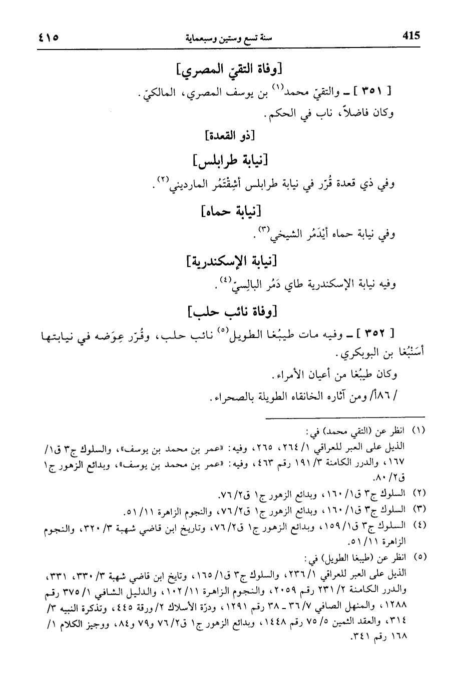 (¬1) انظر عن (التقي محمد) في: الذيل على العبر للعراقي 1/ 264، 265، وفيه: «عمر بن محمد بن يوسف»، والسلوك ج 3 ق 1/ 167، والدرر الكامنة 3/ 191 رقم 463، وفيه: «عمر بن محمد بن يوسف»، وبدائع الزهور ج 1 ق 2/ 80.