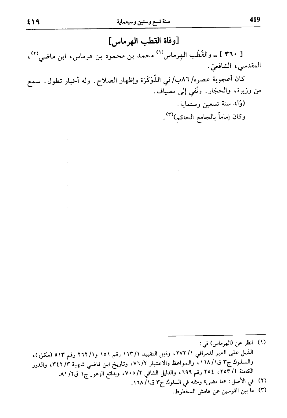 (¬1) انظر عن (الهرماس) في: الذيل على العبر للعراقي 1/ 272، وذيل التقييد 1/ 113 رقم 151 و 1/ 262 رقم 513 (مكرّر)، والسلوك ج 3 ق 1/ 168، والمواعظ والاعتبار 2/ 76، وتاريخ ابن قاضي شهبة 3/ 342، والدرر الكامنة 4/ 253، 254 رقم 699، والدليل الشافي 2/ 705، وبدائع الزهور ج 1 ق 2/ 81.