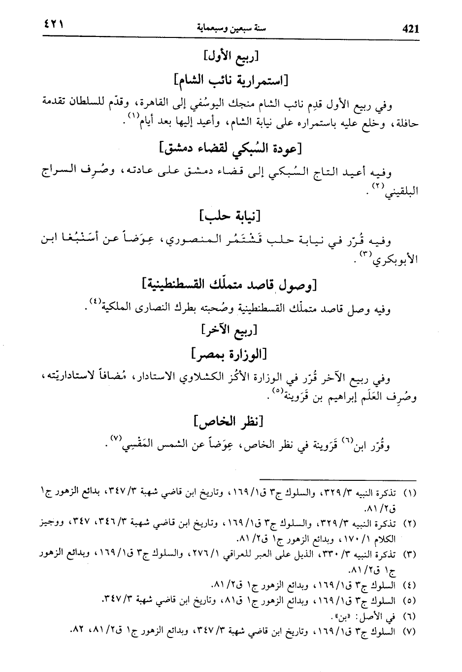 (¬7) السلوك ج 3 ق 1/ 169، وتاريخ ابن قاضي شهبة 3/ 347، وبدائع الزهور ج 1 ق 2/ 81، 82.