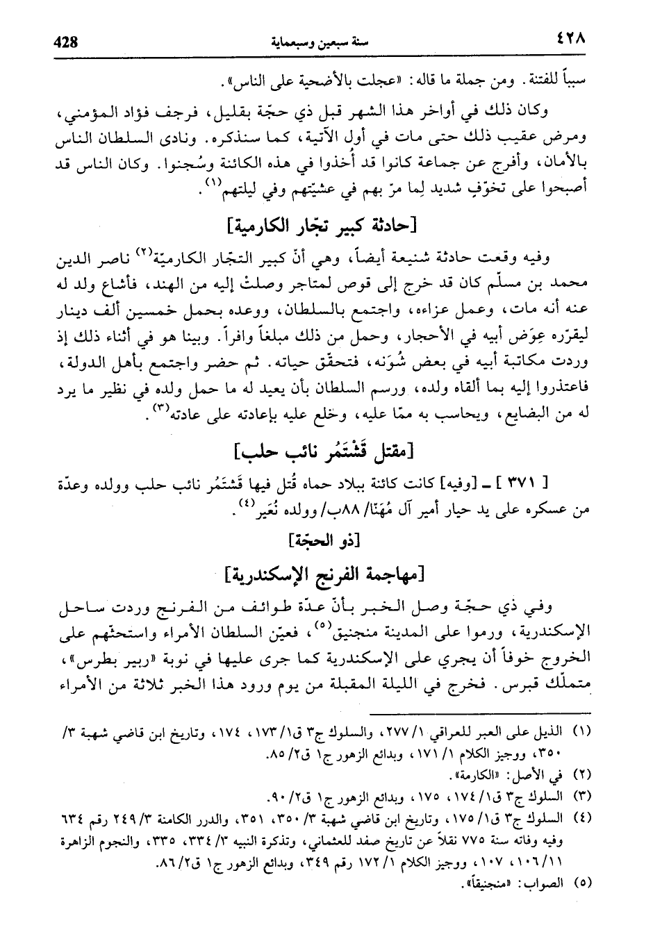 [371]-، [وفيه] كانت كائنة ببلاد حماه قتل فيها قشتمر نائب حلب وولده وعدّة من عسكره على يد حيار أمير آل مهنّا / 88 ب / وولده نعير (¬4).