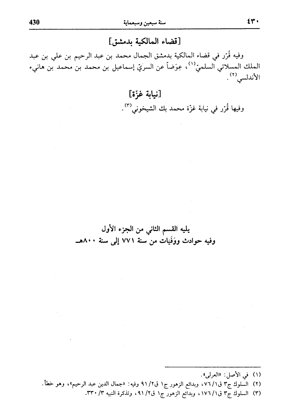 يليه القسم الثاني من الجزء الأول وفيه حوادث ووفيات من سنة 771 إلى سنة 800 هـ