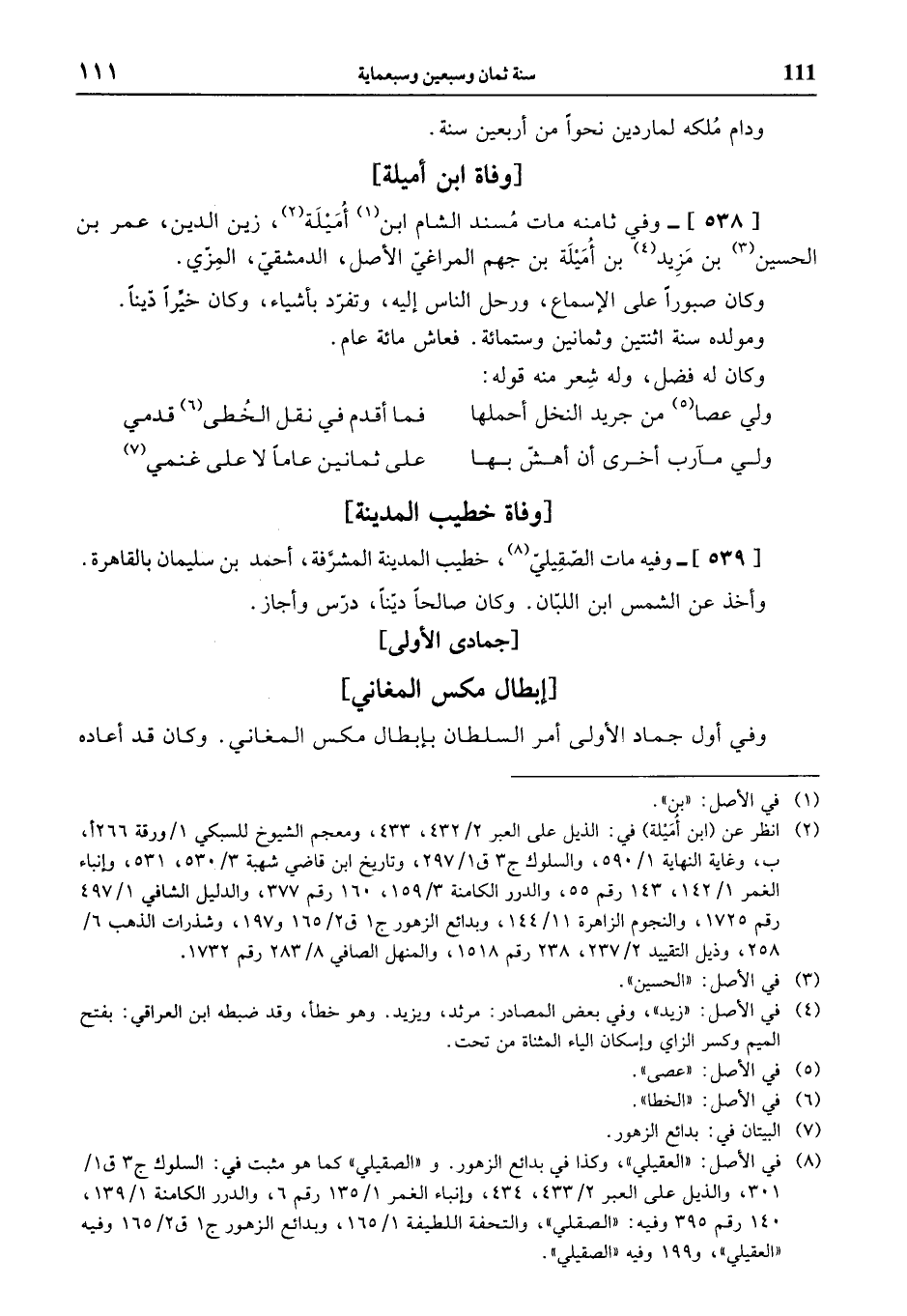 (¬2) انظر عن (ابن أميلة) في: الذيل على العبر 2/ 432، 433، ومعجم الشيوخ للسبكي 1 / ورقة 266 أ، ب، وغاية النهاية 1/ 590، والسلوك ج 3 ق 1/ 297، وتاريخ ابن قاضي شهبة 3/ 530، 531، وإنباء الغمر 1/ 142، 143 رقم 55، والدرر الكامنة 3/ 159، 160 رقم 377، والدليل الشافي 1/ 497 رقم 1725، والنجوم الزاهرة 11/ 144، وبدائع الزهور ج 1 ق 2/ 165 و 197، وشذرات الذهب 6/ 258، وذيل التقييد 2/ 237، 238 رقم 1518، والمنهل الصافي 8/ 283 رقم 1732.
