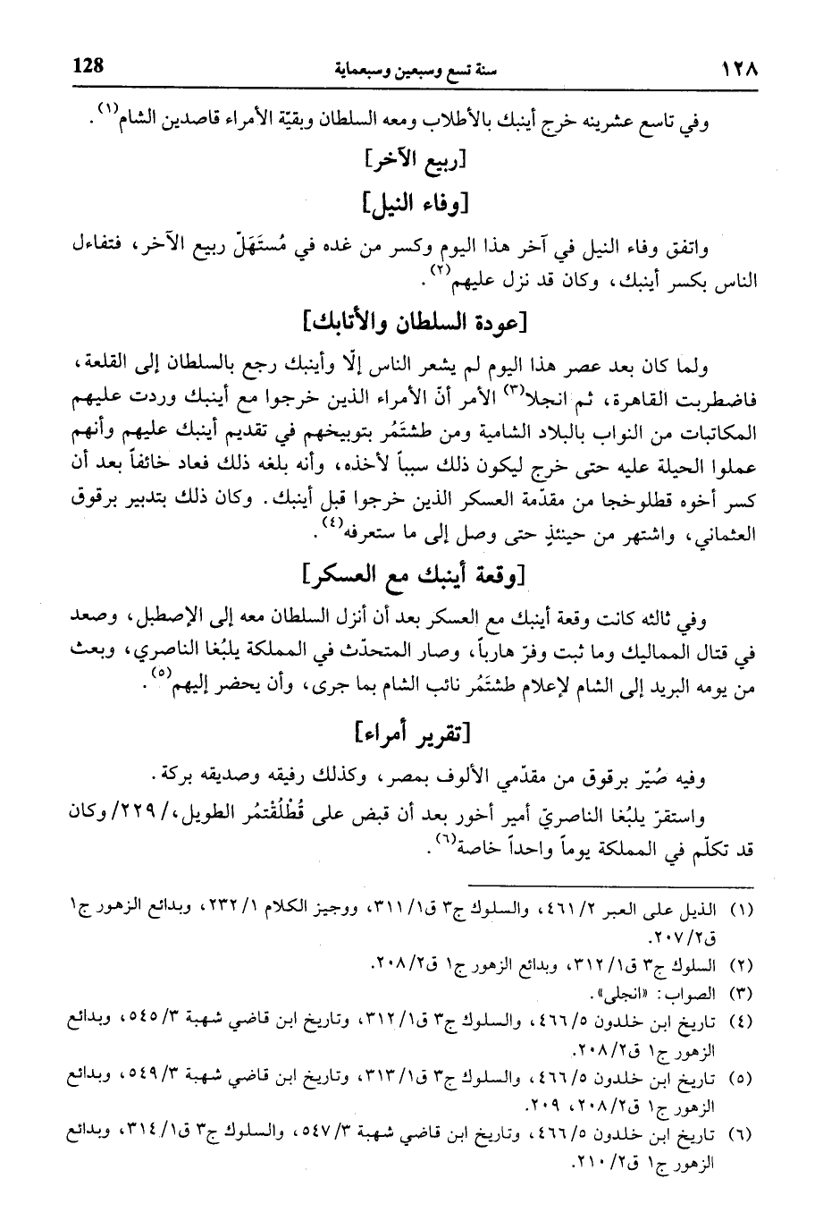 (¬6) تاريخ ابن خلدون 5/ 466، وتاريخ ابن قاضي شهبة 3/ 547، والسلوك ج 3 ق 1/ 314، وبدائع الزهور ج 1 ق 2/ 210.