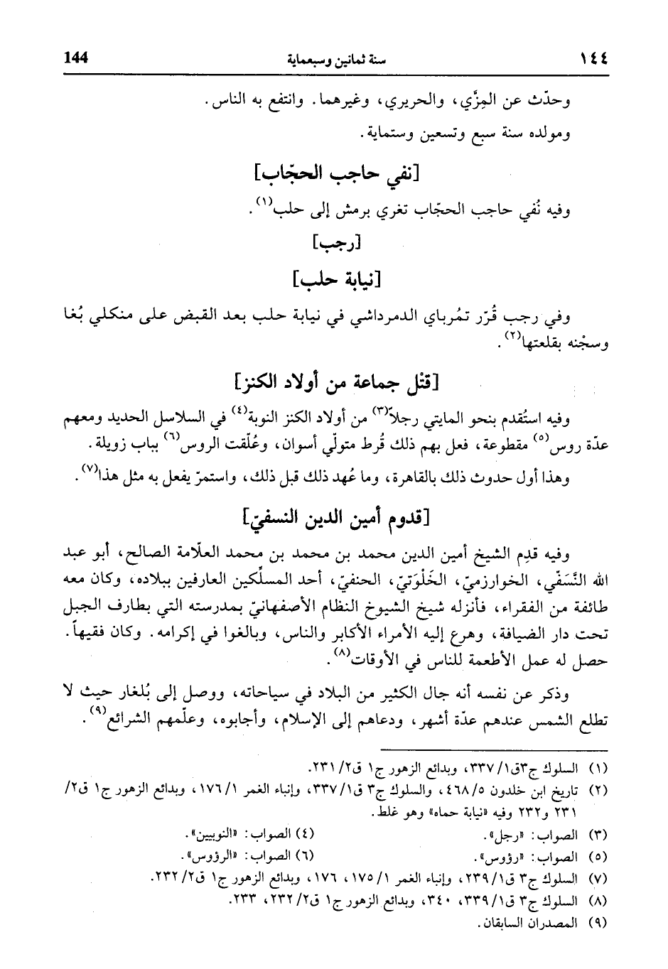 (¬2) تاريخ ابن خلدون 5/ 468، والسلوك ج 3 ق 1/ 337، وإنباء الغمر 1/ 176، وبدائع الزهور ج 1 ق 2/ 231 و 232 وفيه «نيابة حماه» وهو غلط.