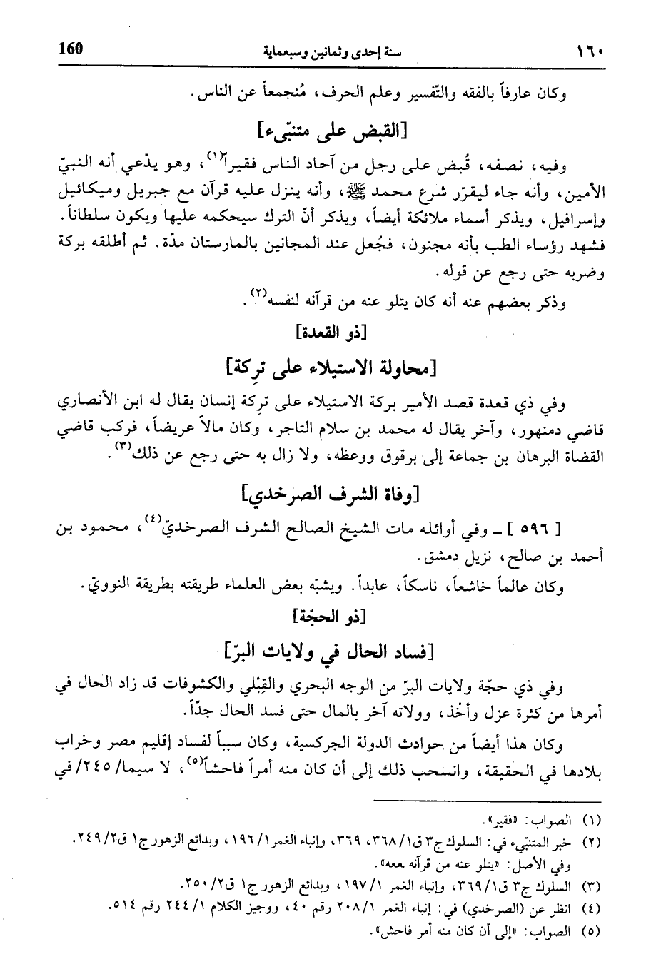 وفيه، نصفه، قبض على رجل من آحاد الناس فقيرا (¬1)، وهو يدّعي أنه النبيّ الأمين، وأنه جاء ليقرّر شرع محمد صلى الله عليه وسلم، وأنه ينزل عليه قرآن مع جبريل وميكائيل وإسرافيل، ويذكر أسماء ملائكة أيضا، ويذكر أنّ الترك سيحكمه عليها ويكون سلطانا. فشهد رؤساء الطب بأنه مجنون، فجعل عند المجانين بالمارستان مدّة. ثم أطلقه بركة وضربه حتى رجع عن قوله.