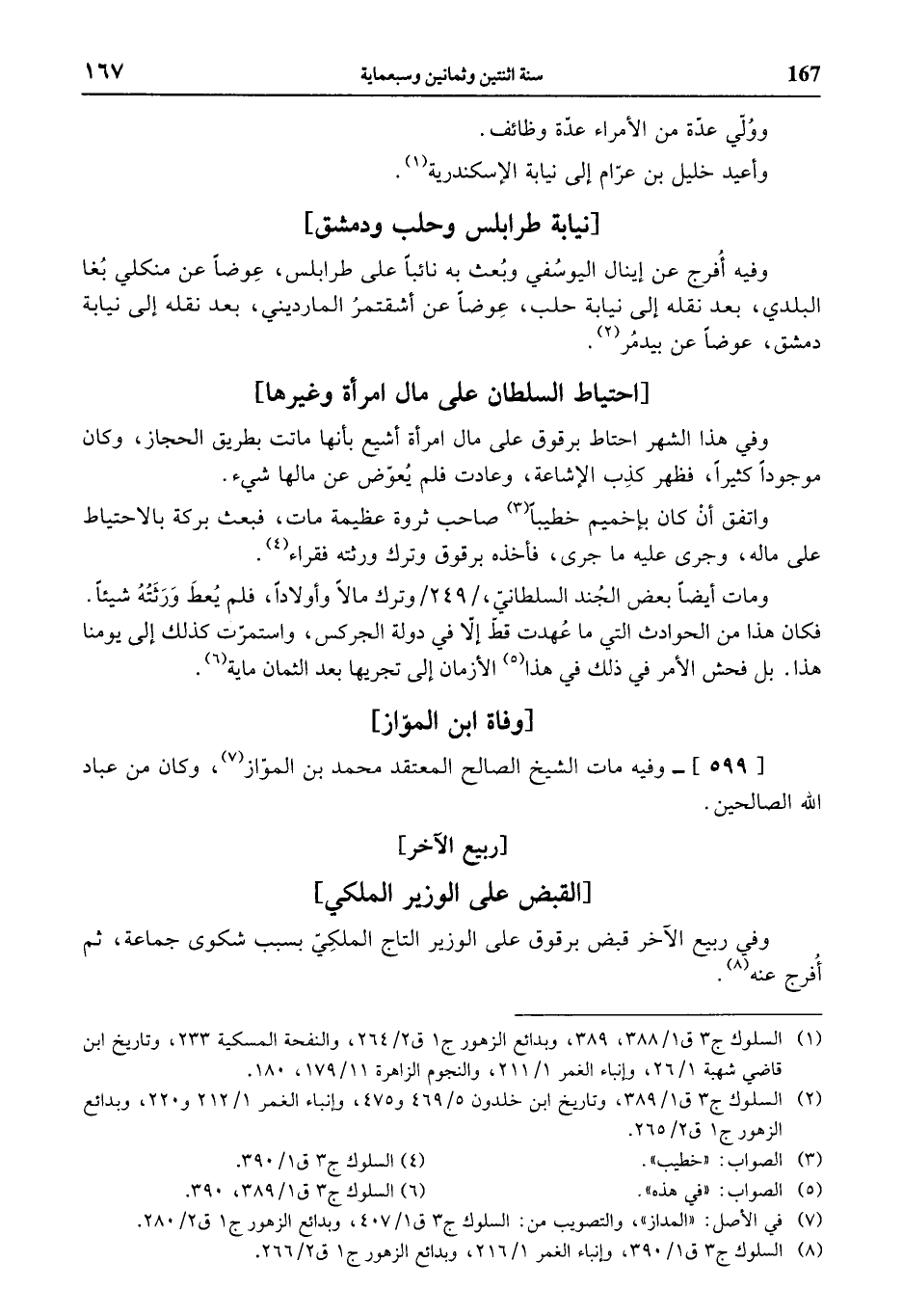 (¬1) السلوك ج 3 ق 1/ 388، 389، وبدائع الزهور ج 1 ق 2/ 264، والنفحة المسكية 233، وتاريخ ابن قاضي شهبة 1/ 26، وإنباء الغمر 1/ 211، والنجوم الزاهرة 11/ 179، 180.