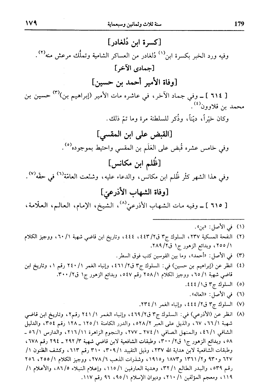 (¬8) انظر عن (الأذرعي) في: السلوك ج 3 ق 2/ 469، وإنباء الغمر 1/ 241 رقم 2، وتاريخ ابن قاضي شهبة 1/ 66، 67، والذيل على العبر 2/ 528، والدرر الكامنة 1/ 125 - 128 رقم 354، والدليل الشافي 1/ 46، والمنهل الصافي 1/ 274 - 277، والنجوم الزاهرة 11/ 216، والدارس 1/ 56 - 58، وبدائع الزهور ج 1 ق 2/ 300، وطبقات الشافعية لابن قاضي شهبة 3/ 292 - 294 رقم 678، وطبقات الشافعية لابن هداية الله 237، وذيل التقييد 1/ 309، 310 رقم 613، وكشف الظنون 1/ 627 و 930 و 2/ 1361 و 1873 و 1915، وشذرات الذهب 6/ 278، ووجيز الكلام 1/ 255، 256 رقم 539، والبدر الطالع 1/ 32، وهدية العارفين 1/ 115، وإعلام النبلاء 5/ 86، والأعلام 1/ 119، ومعجم المؤلفين 1/ 210، وديوان الإسلام 1/ 95، 96 رقم 117.