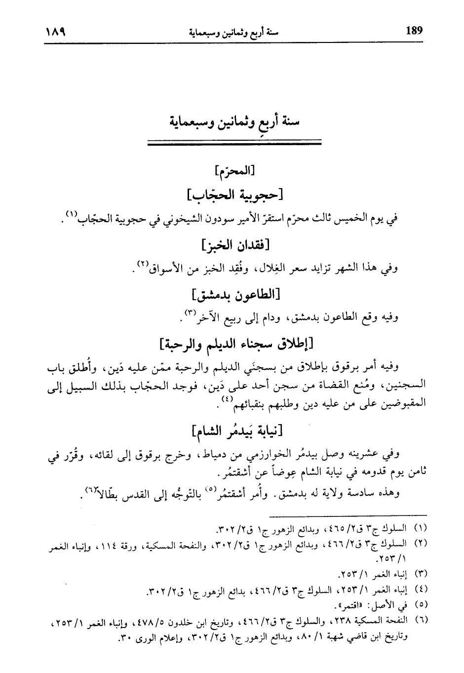 (¬6) النفحة المسكية 238، والسلوك ج 3 ق 2/ 466، وتاريخ ابن خلدون 5/ 478، وإنباء الغمر 1/ 253، وتاريخ ابن قاضي شهبة 1/ 80، وبدائع الزهور ج 1 ق 2/ 302، وإعلام الورى 30.