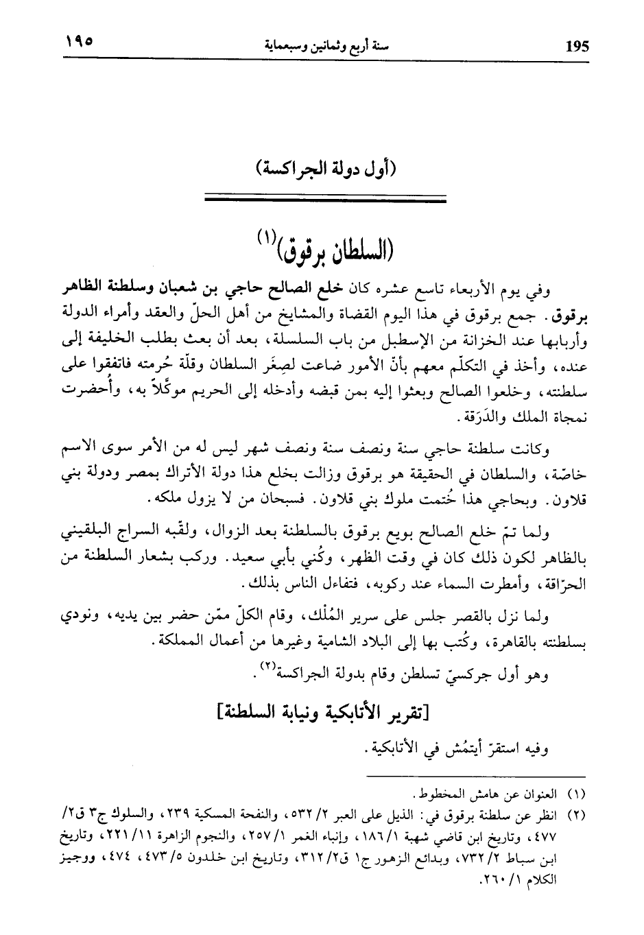 (¬2) انظر عن سلطنة برقوق في: الذيل على العبر 2/ 532، والنفحة المسكية 239، والسلوك ج 3 ق 2/ 477، وتاريخ ابن قاضي شهبة 1/ 186، وإنباء الغمر 1/ 257، والنجوم الزاهرة 11/ 221، وتاريخ ابن سباط 2/ 732، وبدائع الزهور ج 1 ق 2/ 312، وتاريخ ابن خلدون 5/ 473، 474، ووجيز الكلام 1/ 260.