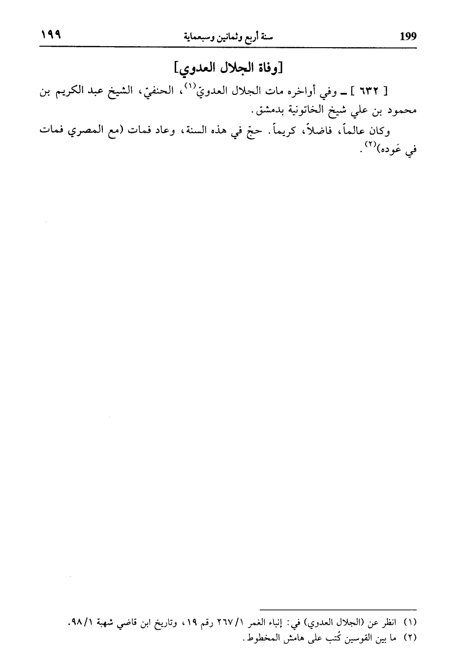 (¬1) انظر عن (الجلال العدوي) في: إنباء الغمر 1/ 267 رقم 19، وتاريخ ابن قاضي شهبة 1/ 98.