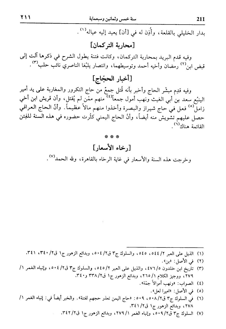 (¬6) في السلوك ج 3 ق 2/ 508، 509: «حاج اليمن تعذر حجهم لفتنة». والخبر أيضا في: إنباء الغمر 1/ 278، وبدائع الزهور ج 1 ق 2/ 341.