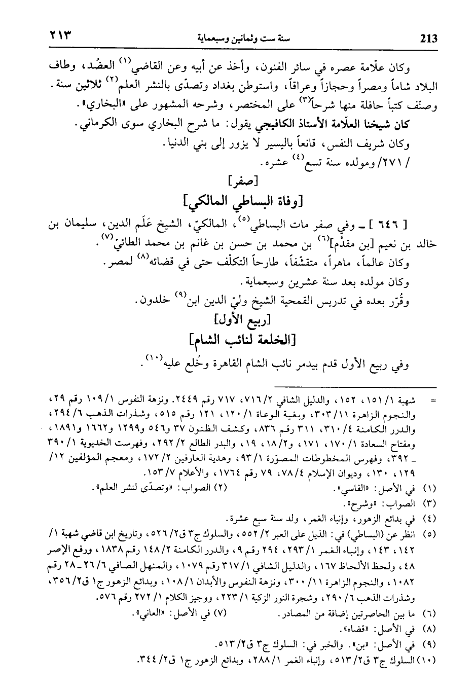 [646]- وفي صفر مات البساطي (¬5)، المالكيّ، الشيخ علم الدين، سليمان بن خالد بن نعيم [بن مقدّم] (¬6) بن محمد بن حسن بن غانم بن محمد الطائيّ (¬7).