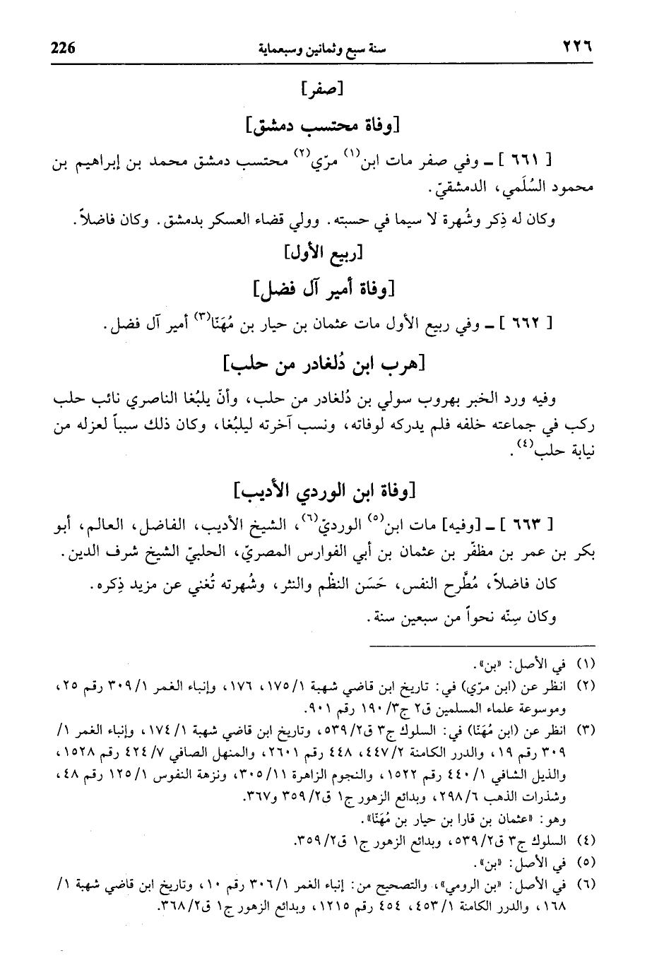 [662]- وفي ربيع الأول مات عثمان بن حيار بن مهنّا (¬3) أمير آل فضل.