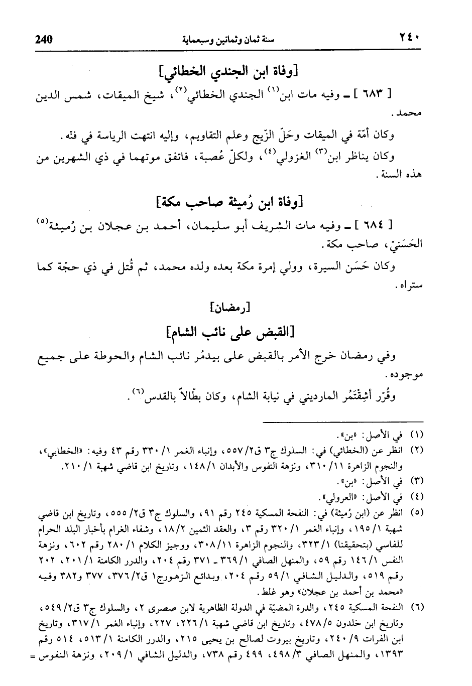 (¬6) النفحة المسكية 245، والدرة المضيّة في الدولة الظاهرية لابن صصرى 2، والسلوك ج 3 ق 2/ 549، وتاريخ ابن خلدون 5/ 478، وتاريخ ابن قاضي شهبة 1/ 226، 227، وإنباء الغمر 1/ 317، وتاريخ ابن الفرات 9/ 240، وتاريخ بيروت لصالح بن يحيى 215، والدرر الكامنة 1/ 513، 514 رقم 1393، والمنهل الصافي 3/ 498، 499 رقم 738، والدليل الشافي 1/ 209، ونزهة النفوس =