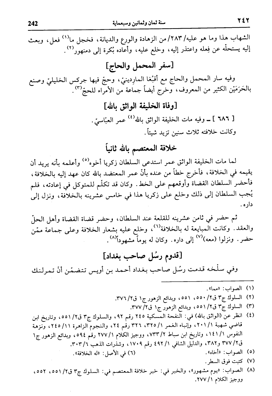 (¬8) الصواب: «يوم مشهور»، والخبر في: خبر خلافة المعتصم في: السلوك ج 3 ق 2/ 551، 552، ووجيز الكلام 1/ 277.