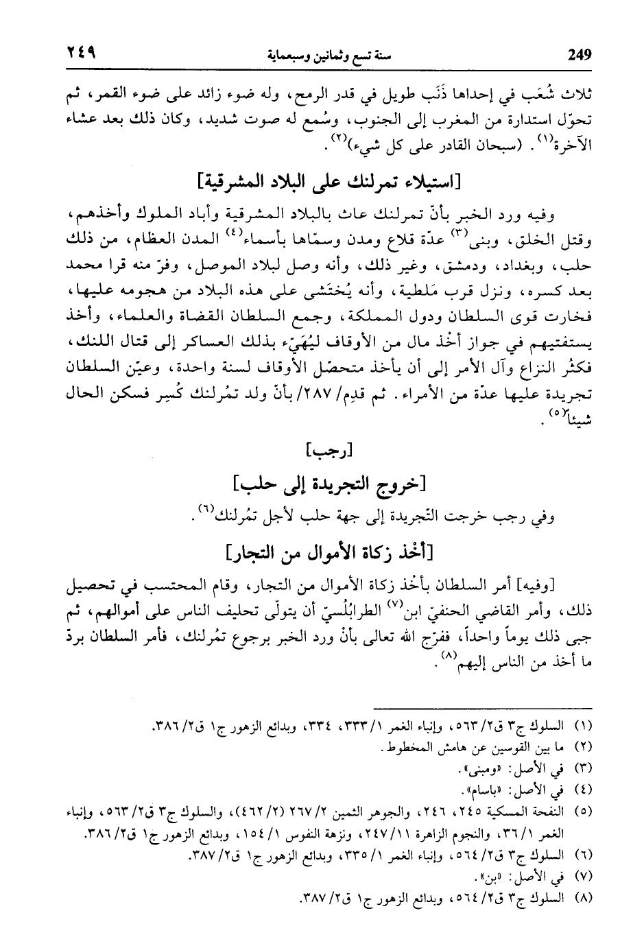 (¬5) النفحة المسكية 245، 246، والجوهر الثمين 2/ 267 (2/ 462)، والسلوك ج 3 ق 2/ 563، وإنباء الغمر 1/ 36، والنجوم الزاهرة 11/ 247، ونزهة النفوس 1/ 154، وبدائع الزهور ج 1 ق 2/ 386.