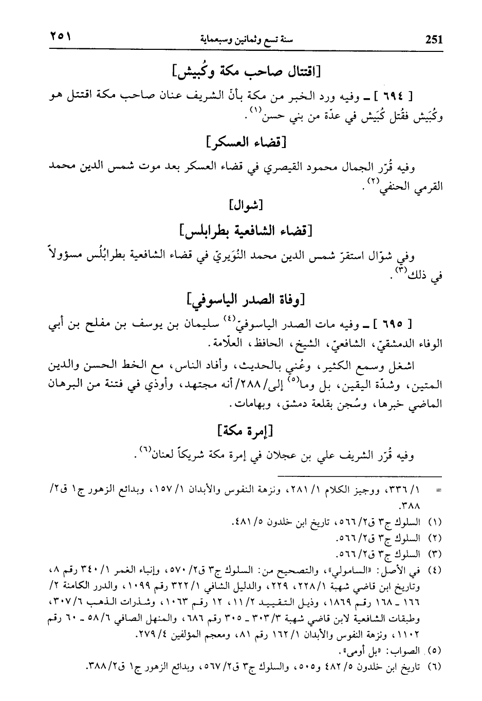 [694]- وفيه ورد الخبر من مكة بأنّ الشريف عنان صاحب مكة اقتتل هو وكبيش فقتل كبيش في عدّة من بني حسن (¬1).