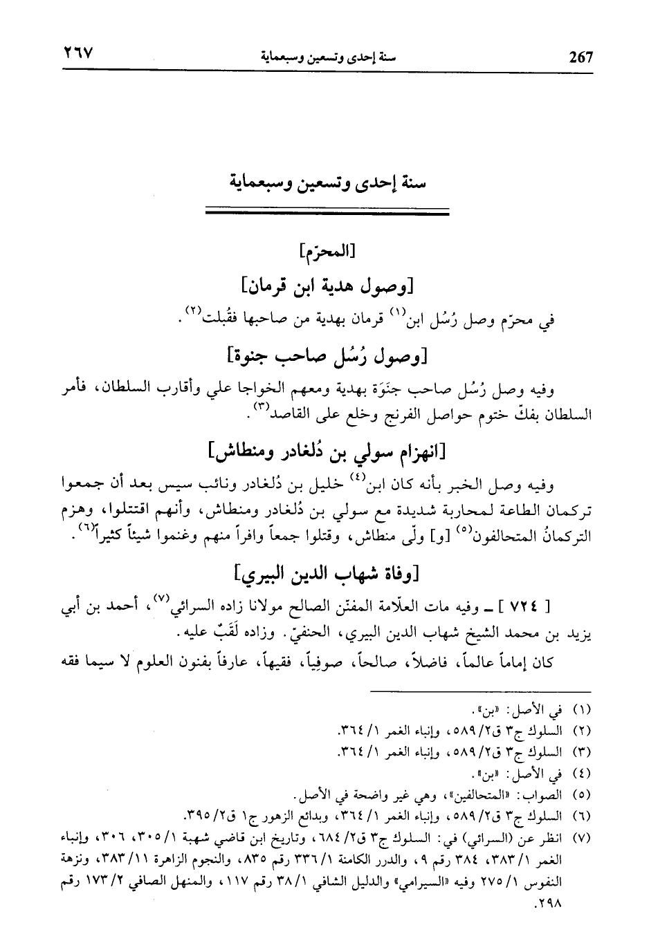(¬7) انظر عن (السرائي) في: السلوك ج 3 ق 2/ 684، وتاريخ ابن قاضي شهبة 1/ 305، 306، وإنباء الغمر 1/ 383، 384 رقم 9، والدرر الكامنة 1/ 336 رقم 835، والنجوم الزاهرة 11/ 383، ونزهة النفوس 1/ 275 وفيه «السيرامي» والدليل الشافي 1/ 38 رقم 117، والمنهل الصافي 2/ 173 رقم 298.