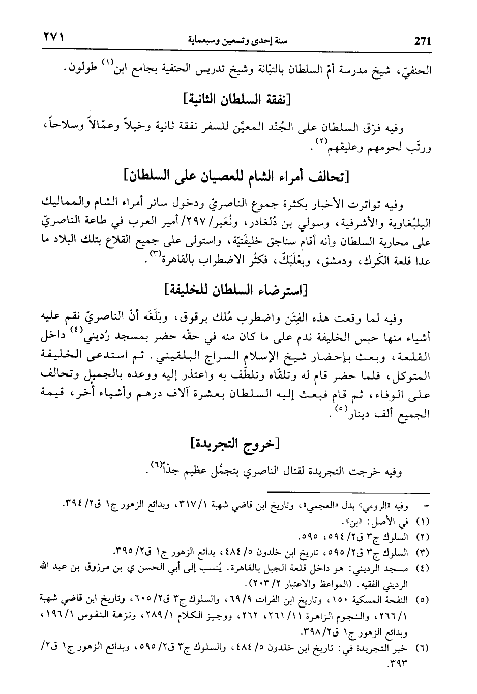 (¬6) خبر التجريدة في: تاريخ ابن خلدون 5/ 484، والسلوك ج 3 ق 2/ 595، وبدائع الزهور ج 1 ق 2/ 393.