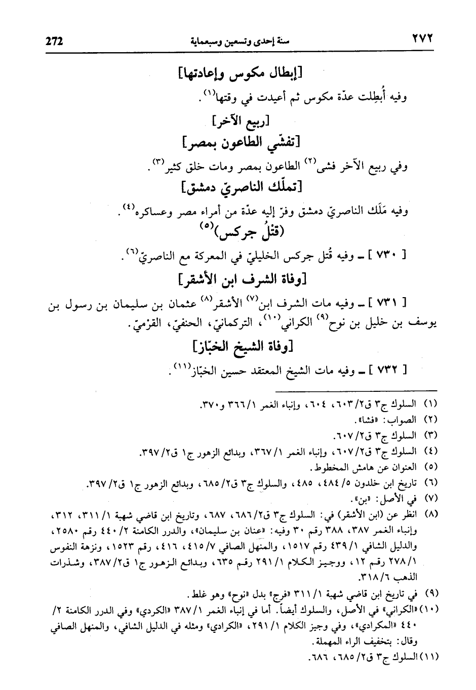 (¬10) «الكراني» في الأصل، والسلوك أيضا. أما في إنباء الغمر 1/ 387 «الكردي» وفي الدرر الكامنة 2/ 440 «المكرادي»، وفي وجيز الكلام 1/ 291، «الكرادي» ومثله في الدليل الشافي، والمنهل الصافي وقال: بتخفيف الراء المهملة.