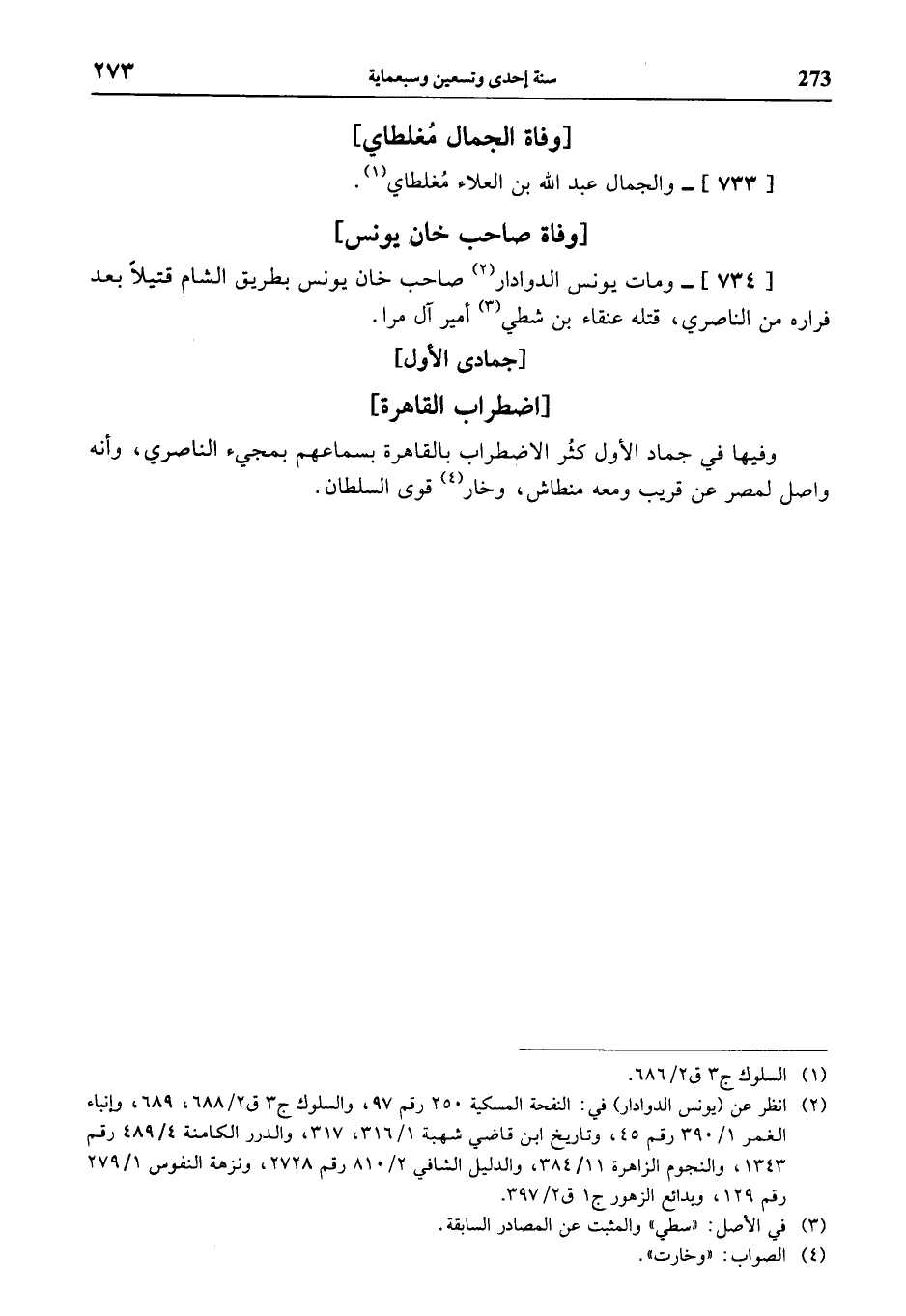 [734]- ومات يونس الدوادار (¬2) صاحب خان يونس بطريق الشام قتيلا بعد فراره من الناصري، قتله عنقاء بن شطي (¬3) أمير آل مرا.