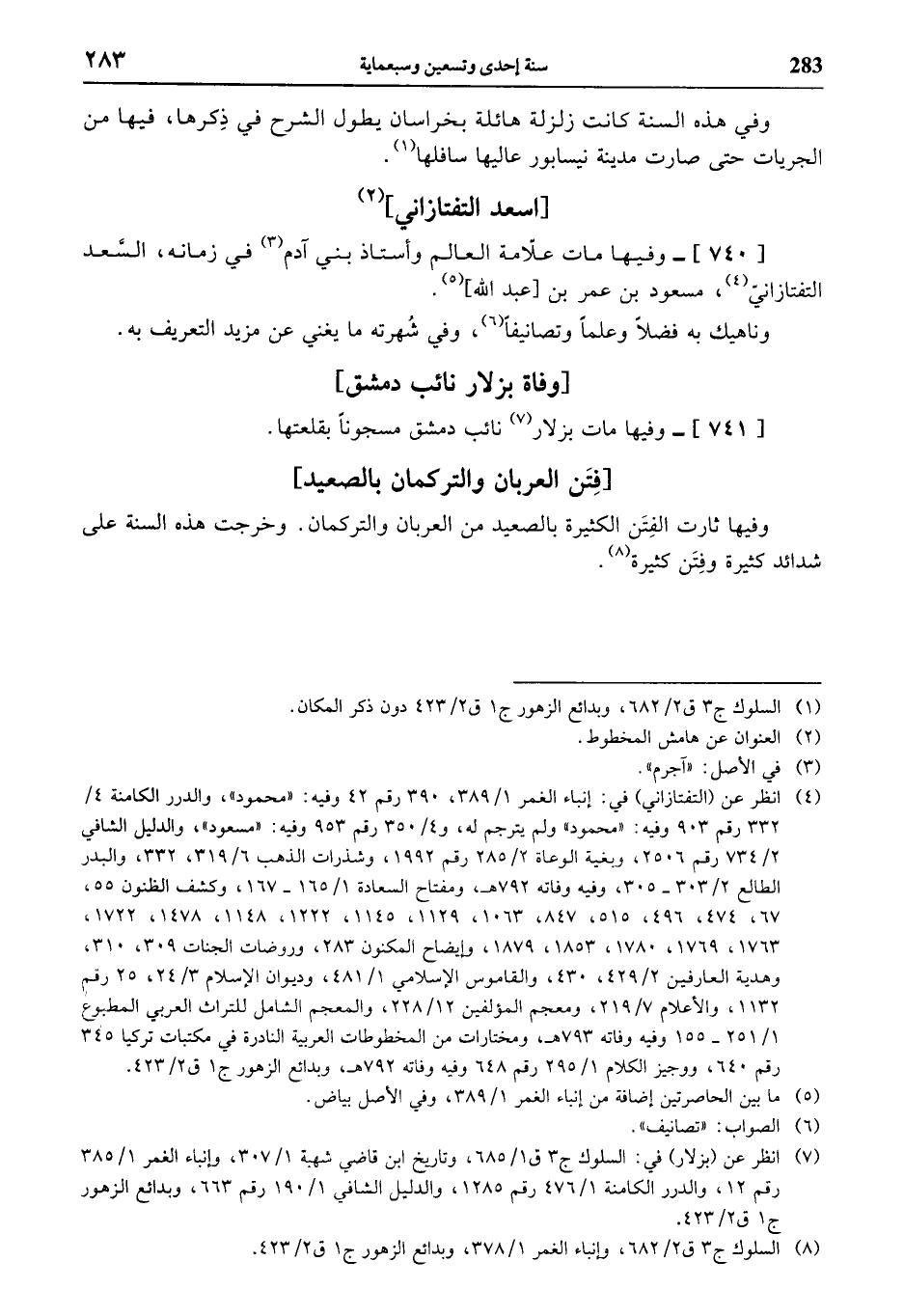 (¬4) انظر عن (التفتازاني) في: إنباء الغمر 1/ 389، 390 رقم 42 وفيه: «محمود»، والدرر الكامنة 4/ 332 رقم 903 وفيه: «محمود» ولم يترجم له، و 4/ 350 رقم 953 وفيه: «مسعود»، والدليل الشافي 2/ 734 رقم 2506، وبغية الوعاة 2/ 285 رقم 1992، وشذرات الذهب 6/ 319، 332، والبدر الطالع 2/ 303 - 305، وفيه وفاته 792 هـ، ومفتاح السعادة 1/ 165 - 167، وكشف الظنون 55، 67، 474، 496، 515، 847، 1063، 1129، 1145، 1222، 1148، 1478، 1722، 1763، 1769، 1780، 1853، 1879، وإيضاح المكنون 283، وروضات الجنات 309، 310، وهدية العارفين 2/ 429، 430، والقاموس الإسلامي 1/ 481، وديوان الإسلام 3/ 24، 25 رقم 1132، والأعلام 7/ 219، ومعجم المؤلفين 12/ 228، والمعجم الشامل للتراث العربي المطبوع 1/ 251 - 155 وفيه وفاته 793 هـ، ومختارات من المخطوطات العربية النادرة في مكتبات تركيا 345 رقم 640، ووجيز الكلام 1/ 295 رقم 648 وفيه وفاته 792 هـ، وبدائع الزهور ج 1 ق 2/ 423.