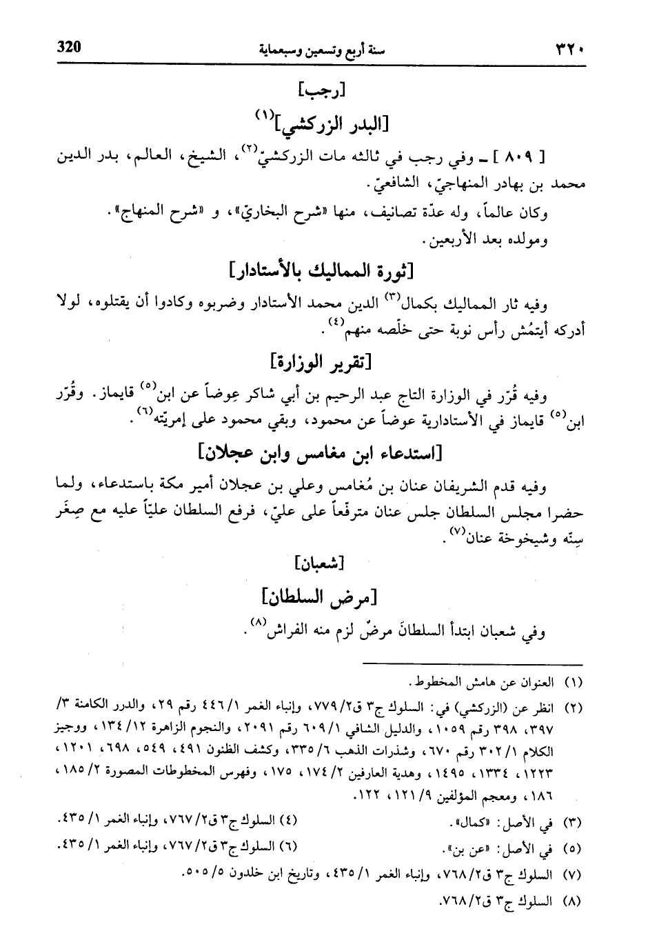 (¬2) انظر عن (الزركشي) في: السلوك ج 3 ق 2/ 779، وإنباء الغمر 1/ 446 رقم 29، والدرر الكامنة 3/ 397، 398 رقم 1059، والدليل الشافي 1/ 609 رقم 2091، والنجوم الزاهرة 12/ 134، ووجيز الكلام 1/ 302 رقم 670، وشذرات الذهب 6/ 335، وكشف الظنون 491، 549، 698، 1201، 1223، 1334، 1495، وهدية العارفين 2/ 174، 175، وفهرس المخطوطات المصورة 2/ 185، 186، ومعجم المؤلفين 9/ 121، 122.