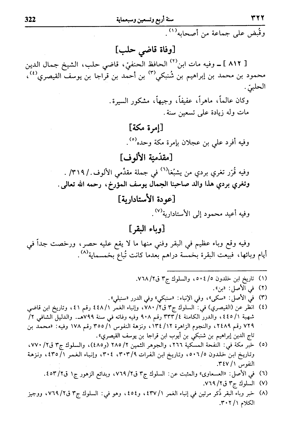 (¬8) خبر وباء البقر ذكر مرتين في إنباء الغمر 1/ 437، و 454، وهو في: السلوك ج 3 ق 2/ 769، ووجيز الكلام 1/ 302.