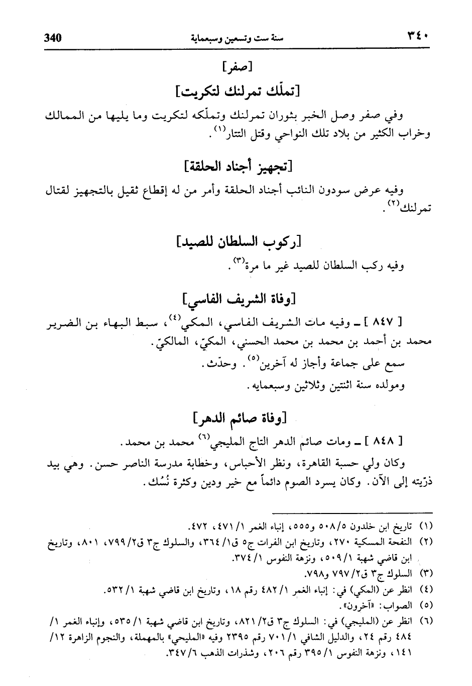 (¬2) النفحة المسكية 270، وتاريخ ابن الفرات ج 5 ق 1/ 364، والسلوك ج 3 ق 2/ 799، 801، وتاريخ ابن قاضي شهبة 1/ 509، ونزهة النفوس 1/ 374.