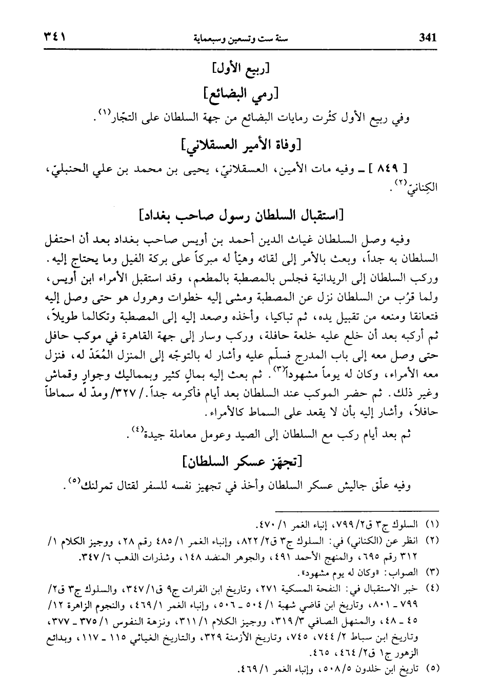 (¬4) خبر الاستقبال في: النفحة المسكية 271، وتاريخ ابن الفرات ج 9 ق 1/ 347، والسلوك ج 3 ق 2/ 799 - 801، وتاريخ ابن قاضي شهبة 1/ 504 - 506، وإنباء الغمر 1/ 469، والنجوم الزاهرة 12/ 45 - 48، والمنهل الصافي 3/ 319، ووجيز الكلام 1/ 311، ونزهة النفوس 1/ 375 - 377، وتاريخ ابن سباط 2/ 744، 745، وتاريخ الأزمنة 329، والتاريخ الغياثي 115 - 117، وبدائع الزهور ج 1 ق 2/ 464، 465.