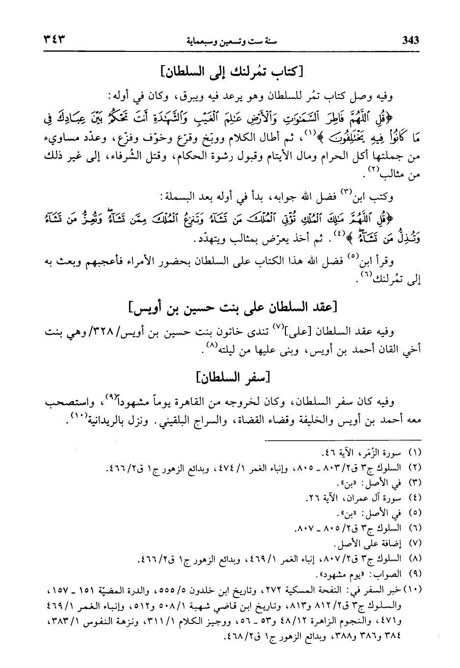 (¬10) خبر السفر في: النفحة المسكية 272، وتاريخ ابن خلدون 5/ 555، والدرة المضيّة 151 - 157، والسلوك ج 3 ق 2/ 812 و 813، وتاريخ ابن قاضي شهبة 1/ 508 و 512، وإنباء الغمر 1/ 469 و 471، والنجوم الزاهرة 12/ 48 و 53 - 56، ووجيز الكلام 1/ 311، ونزهة النفوس 1/ 383، 384 و 386 و 388، وبدائع الزهور ج 1 ق 2/ 468.