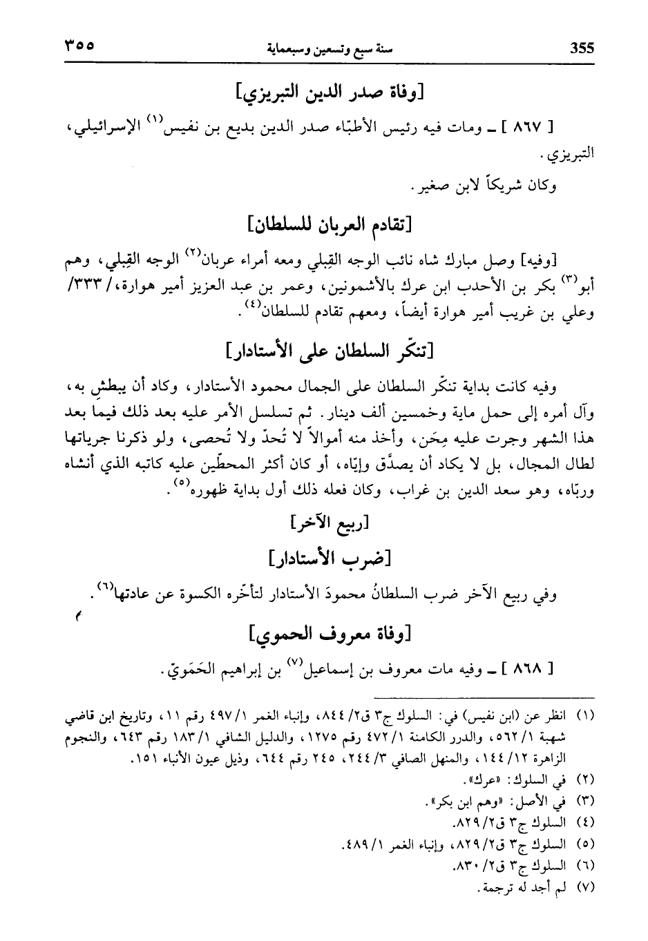 (¬5) السلوك ج 3 ق 2/ 829، وإنباء الغمر 1/ 489.