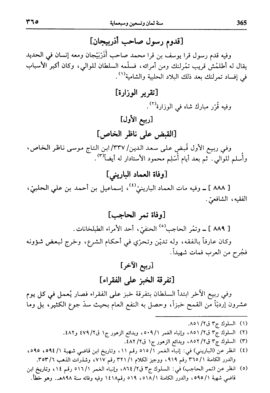 (¬5) انظر عن (تمر الحاجب) في: السلوك ج 3 ق 2/ 864، وإنباء الغمر 1/ 516 رقم 14، وتاريخ ابن قاضي شهبة 1/ 595، والدرر الكامنة 1/ 518، 519 رقم 1418 وفيه وفاته سنة 898 هـ. وهو خطأ.