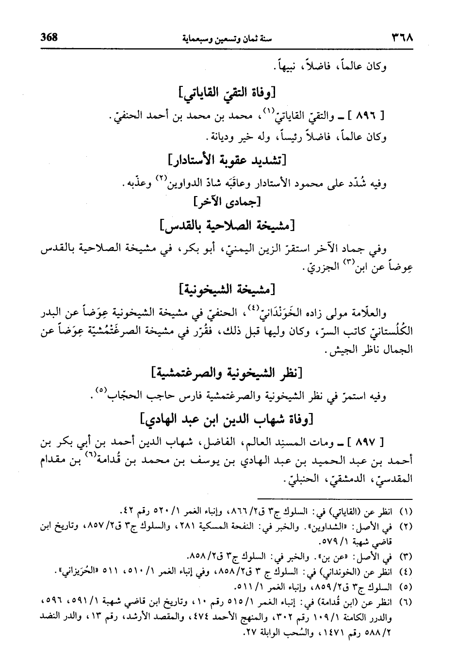 (¬6) انظر عن (ابن قدامة) في: إنباء الغمر 1/ 515 رقم 10، وتاريخ ابن قاضي شهبة 1/ 591، 596، والدرر الكامنة 1/ 109 رقم 302، والمنهج الأحمد 474، والمقصد الأرشد، رقم 13، والدر النضد 2/ 588 رقم 1471، والسحب الوابلة 27.