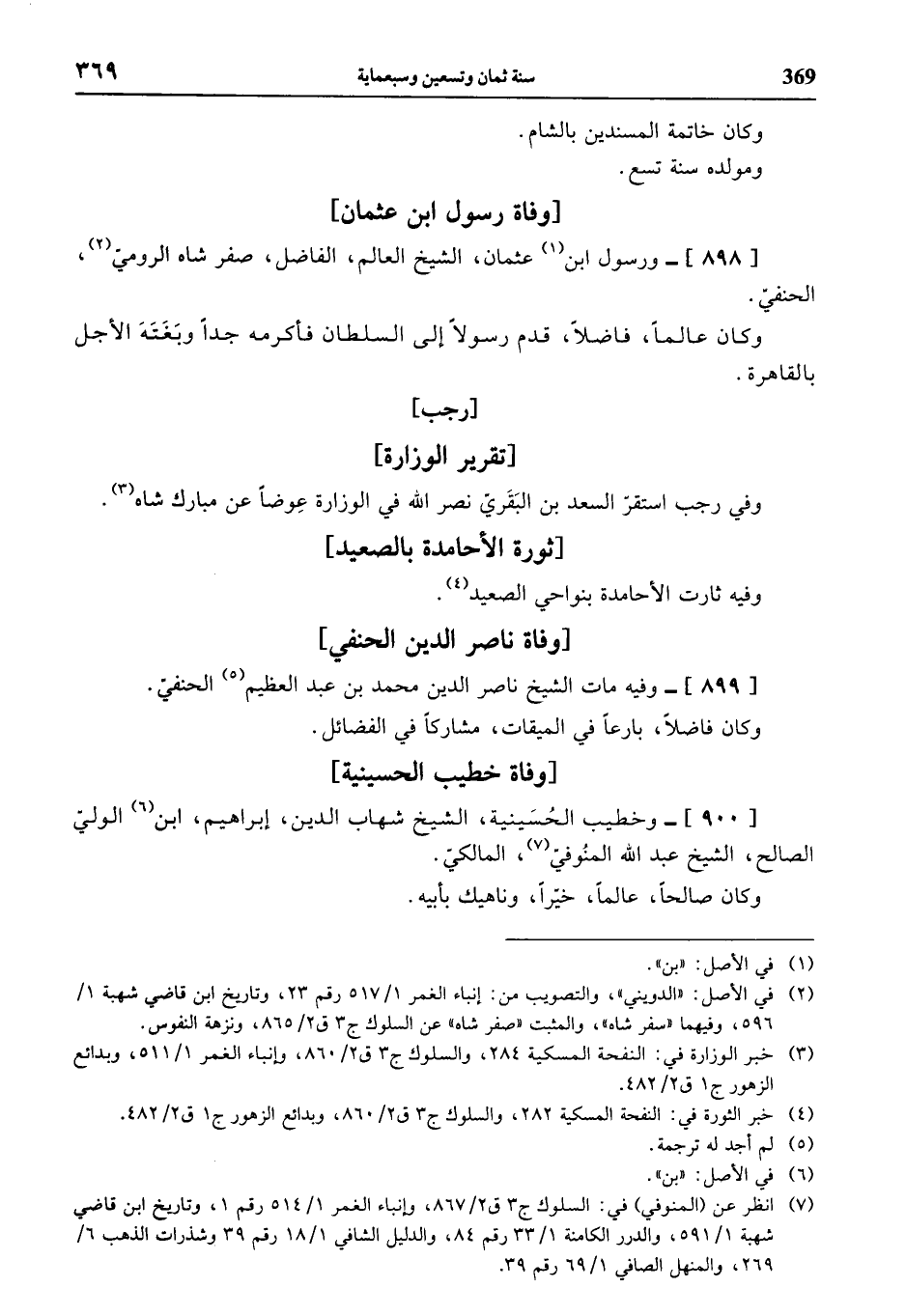 (¬3) خبر الوزارة في: النفحة المسكية 284، والسلوك ج 3 ق 2/ 860، وإنباء الغمر 1/ 511، وبدائع الزهور ج 1 ق 2/ 482.