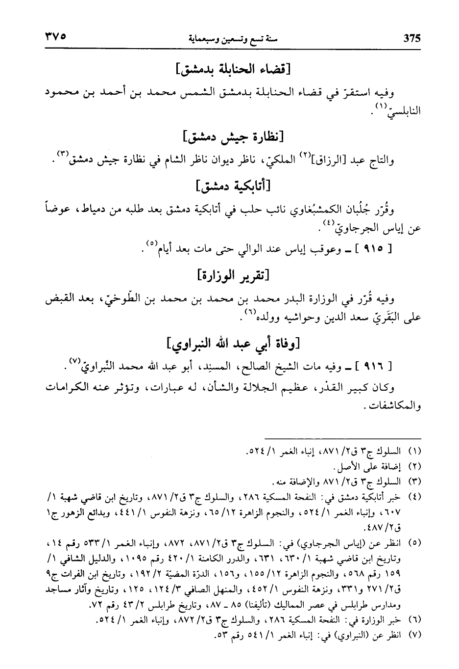 (¬4) خبر أتابكية دمشق في: النفحة المسكية 286، والسلوك ج 3 ق 2/ 871، وتاريخ ابن قاضي شهبة 1/ 607، وإنباء الغمر 1/ 524، والنجوم الزاهرة 12/ 65، ونزهة النفوس 1/ 441، وبدائع الزهور ج 1 ق 2/ 487.