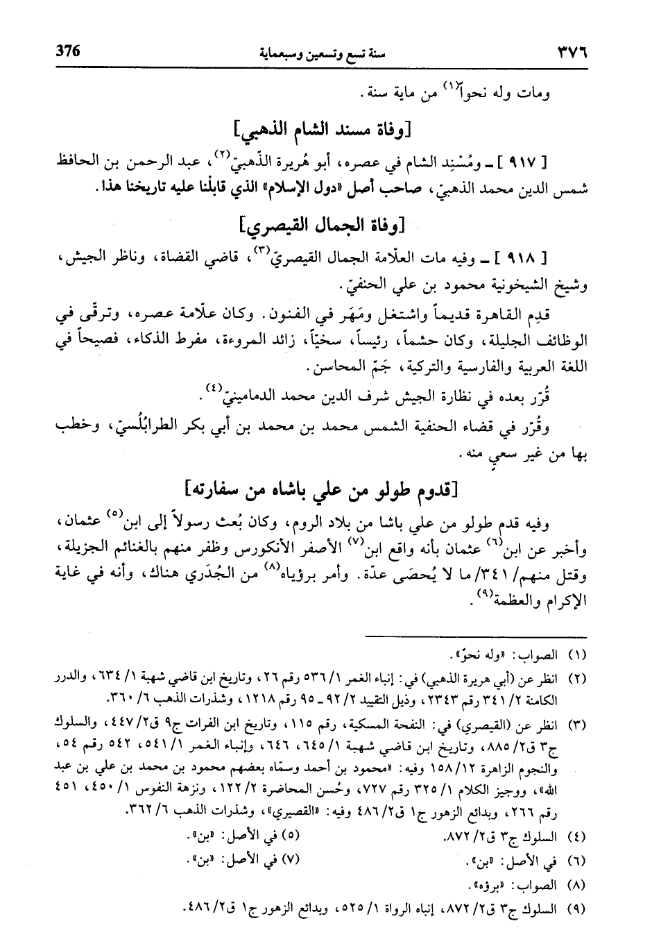 (¬9) السلوك ج 3 ق 2/ 872، إنباه الرواة 1/ 525، وبدائع الزهور ج 1 ق 2/ 486.