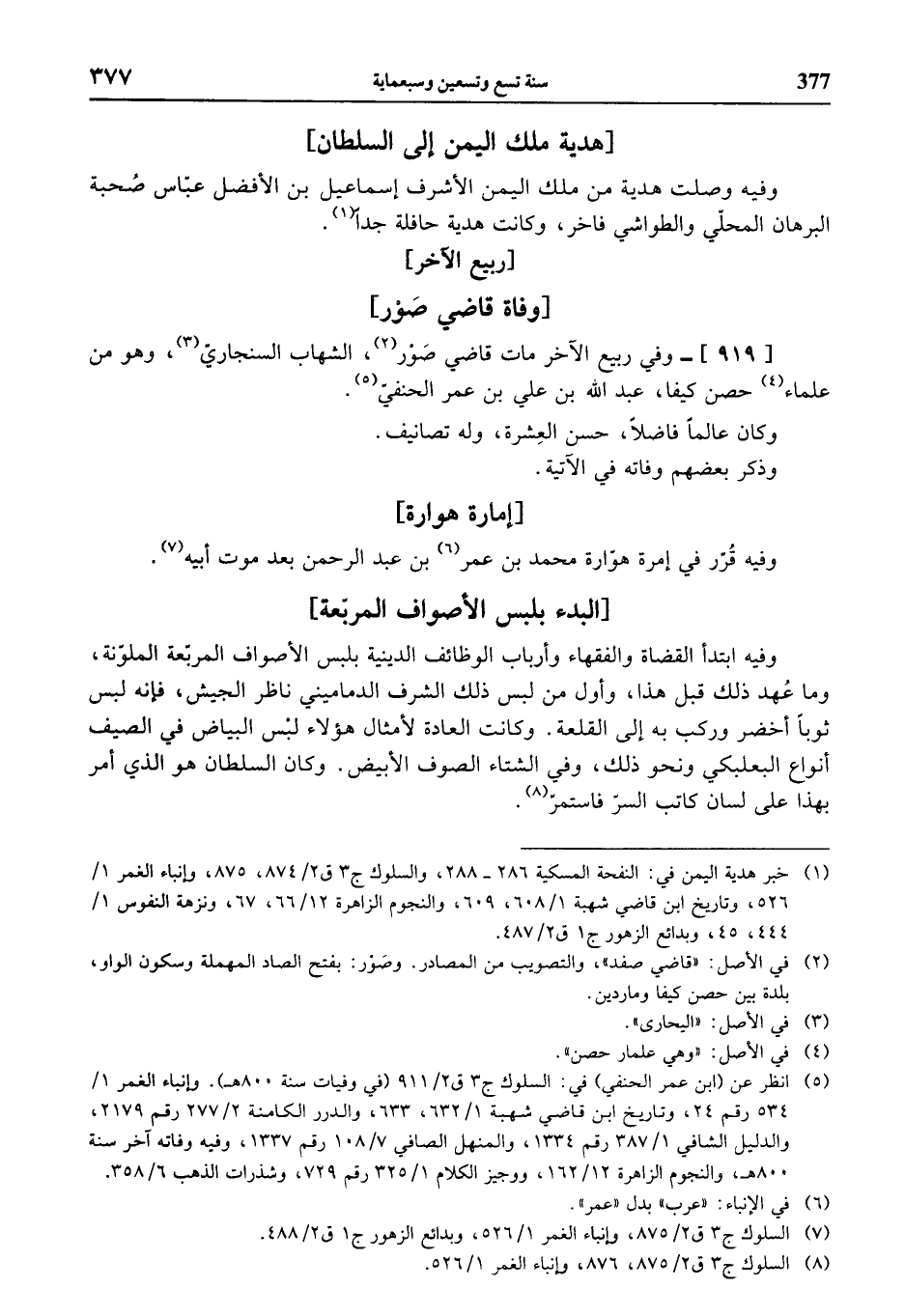 (¬1) خبر هدية اليمن في: النفحة المسكية 286 - 288، والسلوك ج 3 ق 2/ 874، 875، وإنباء الغمر 1/ 526، وتاريخ ابن قاضي شهبة 1/ 608، 609، والنجوم الزاهرة 12/ 66، 67، ونزهة النفوس 1/ 444، 45، وبدائع الزهور ج 1 ق 2/ 487.