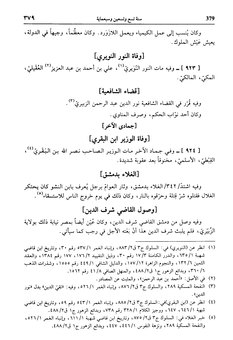 (¬4) انظر عن (ابن البقري) في: السلوك ج 3 ق 2/ 885، وإنباء الغمر 1/ 543 رقم 59، وتاريخ ابن قاضي شهبة 1/ 646، 647، ووجيز الكلام 1/ 328 رقم 738، وبدائع الزهور ج 1 ق 2/ 488.