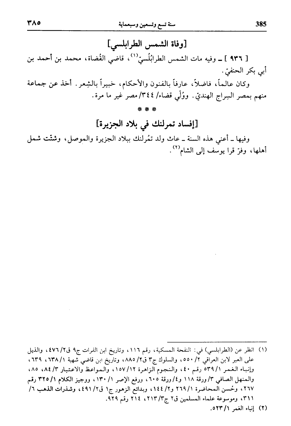 (¬1) انظر عن (الطرابلسي) في: النفحة المسكية، رقم 116، وتاريخ ابن الفرات ج 9 ق 2/ 476، والذيل على العبر لابن العراقي 2/ 550، والسلوك ج 3 ق 2/ 885، وتاريخ ابن قاضي شهبة 1/ 638، 639، وإنباء الغمر 1/ 539 رقم 40، والنجوم الزاهرة 12/ 157، والمواعظ والاعتبار 3/ 84، 85، والمنهل الصافي 3 / ورقة 118 و 4 / ورقة 605، ورفع الإصر 1/ 130، ووجيز الكلام 1/ 325 رقم 267، وحسن المحاضرة 1/ 269 و 2/ 144، وبدائع الزهور ج 1 ق 2/ 491، وشذرات الذهب 6/ 311، وموسوعة علماء المسلمين ق 2 ج 3/ 213، 214 رقم 929.