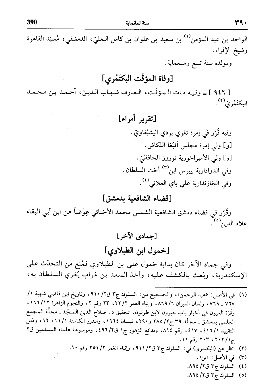 (¬2) انظر عن (البكتمري) في: السلوك ج 3 ق 2/ 911، وإنباء الغمر 2/ 251 رقم 10.