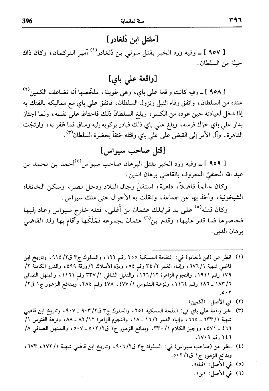 (¬3) خبر واقعة علي باي في: النفحة المسكية 254، والسلوك ج 3 ق 2/ 903 - 907، وتاريخ ابن قاضي شهبة 1/ 633 - 665، وإنباء الغمر 2/ 16 - 18، والنجوم الزاهرة 12/ 82 - 88، ونزهة النفوس 1/ 466 - 471، ووجيز الكلام 1/ 330، وبدائع الزهور ج 1 ق 2/ 502 - 507، والمنهل الصافي 8/ 246 رقم 1709.