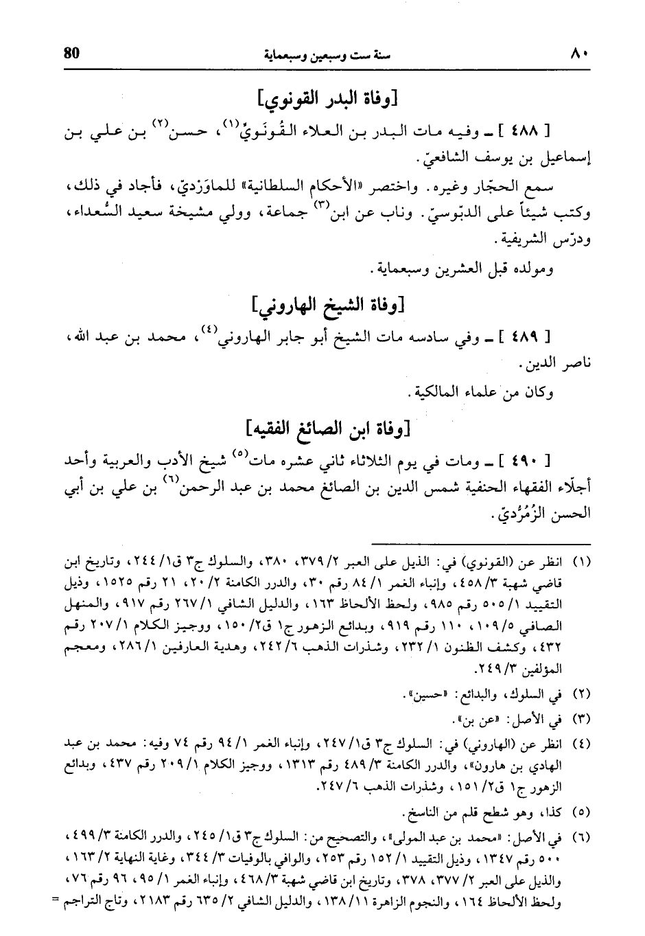 (¬4) انظر عن (الهاروني) في: السلوك ج 3 ق 1/ 247، وإنباء الغمر 1/ 94 رقم 74 وفيه: محمد بن عبد الهادي بن هارون»، والدرر الكامنة 3/ 489 رقم 1313، ووجيز الكلام 1/ 209 رقم 437، وبدائع الزهور ج 1 ق 2/ 151، وشذرات الذهب 6/ 247.